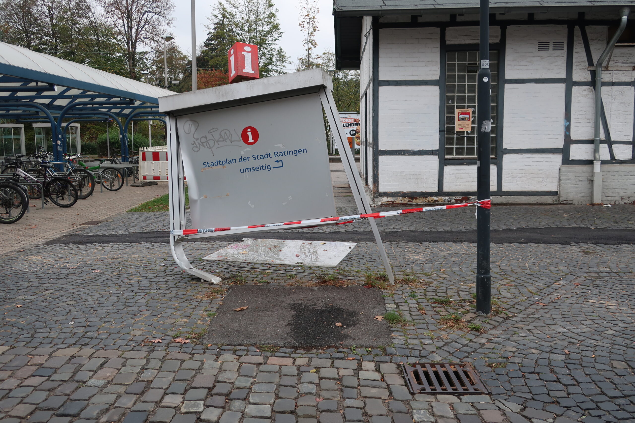 Hösel S-Bahnhof, umgefahrerer Schaukasten - Nov. 2018