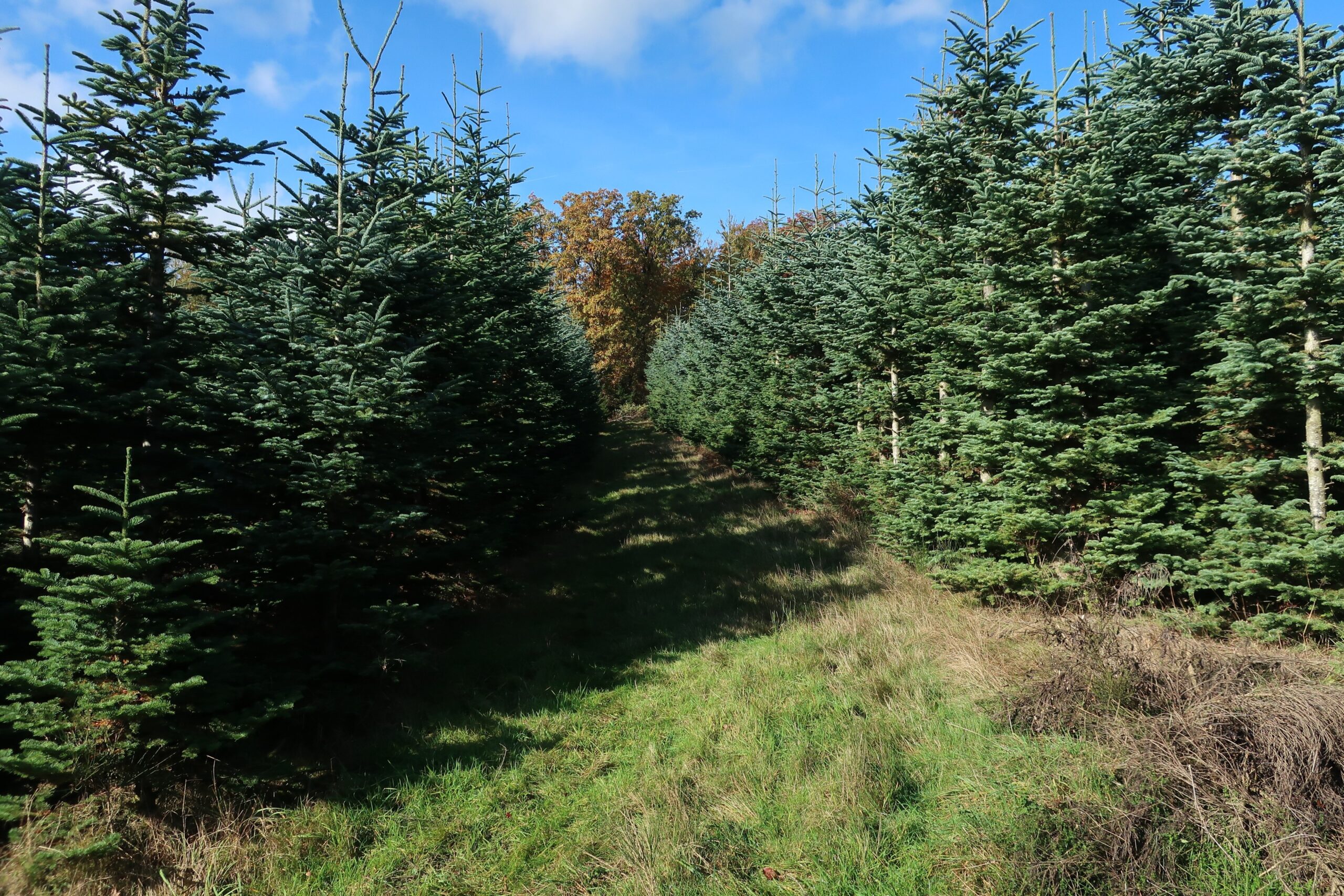 Im Oktober 2025 schauen wir hier in die – bereits etwas durchgewachsene – Blaufichten-Plantage (die Blickrichtung ist auf dem Luftbild von 2021 mit einem kleinen weißen Pfeil markiert). Im Hintergrund sehen wir einen herbstlichen Laubwald, der bisher allem Sturm- und Trockenstress standgehalten hat.