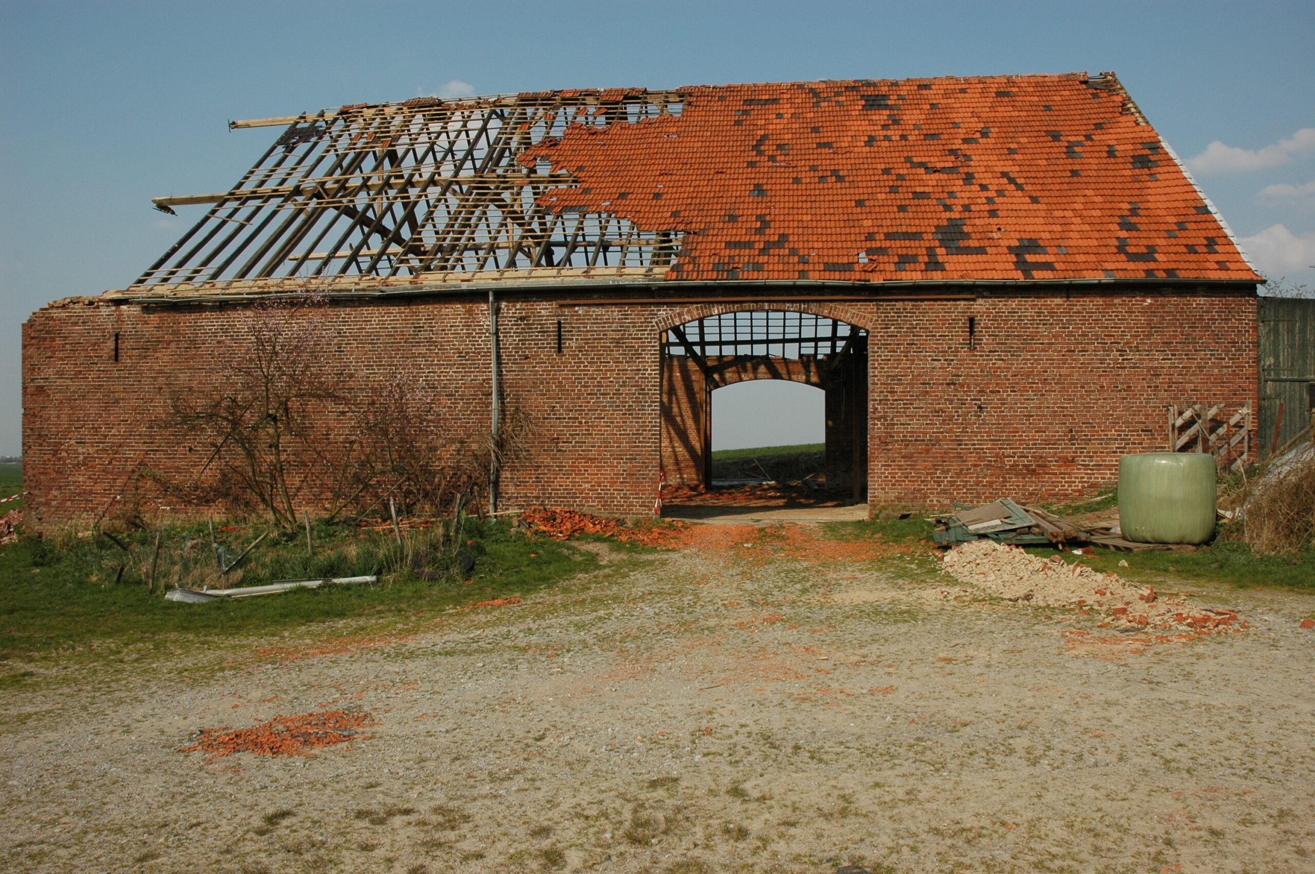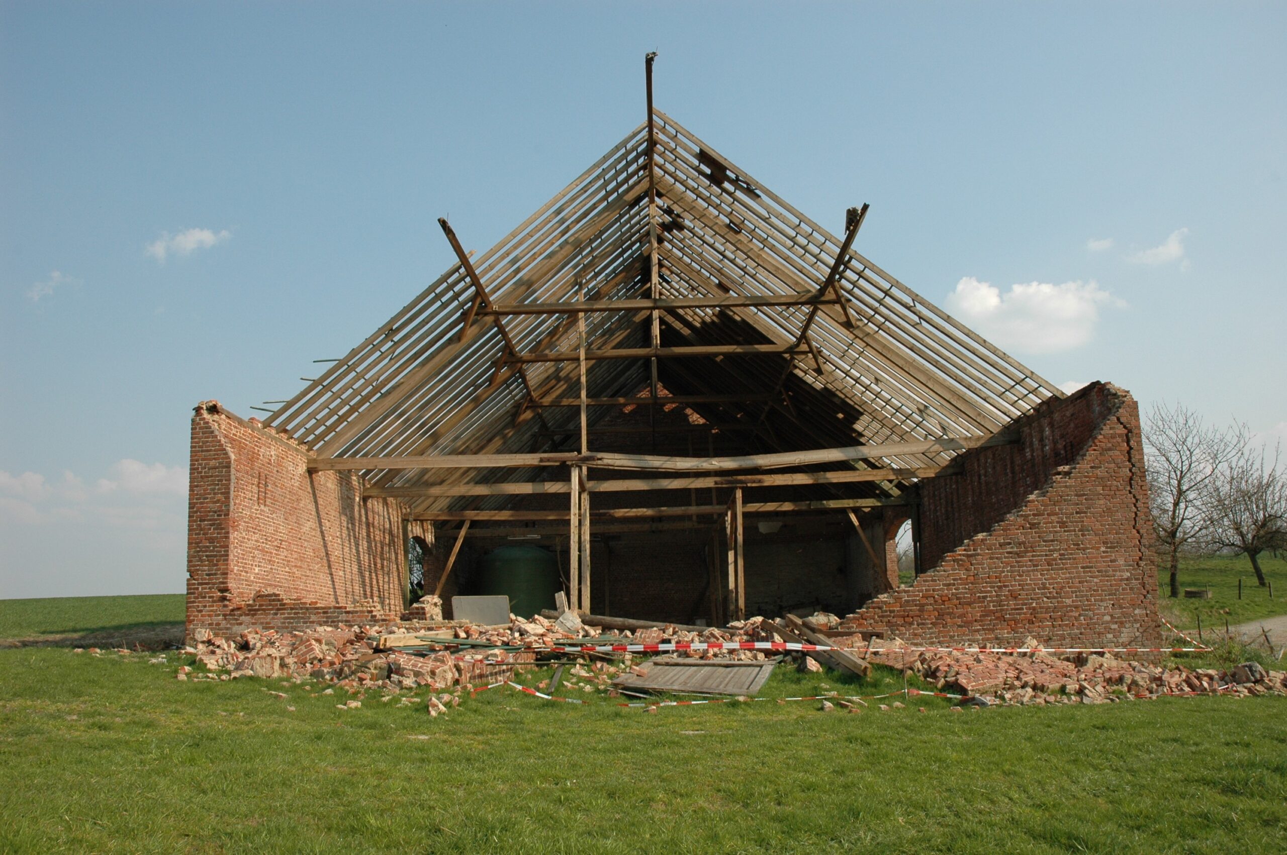 Nur die große Backstein-Scheune und einige Obstwiesen waren vom Hof Obenmetzges geblieben. Das Startbild folgt der Richtung des Sturms. Beinahe senkrecht auf die Giebelfront der Scheune wirkte der Druck (mit leichter Abweichung nach links, siehe die stärkere Dachziegel-Abdeckung dort), der Giebel brach nach innen.