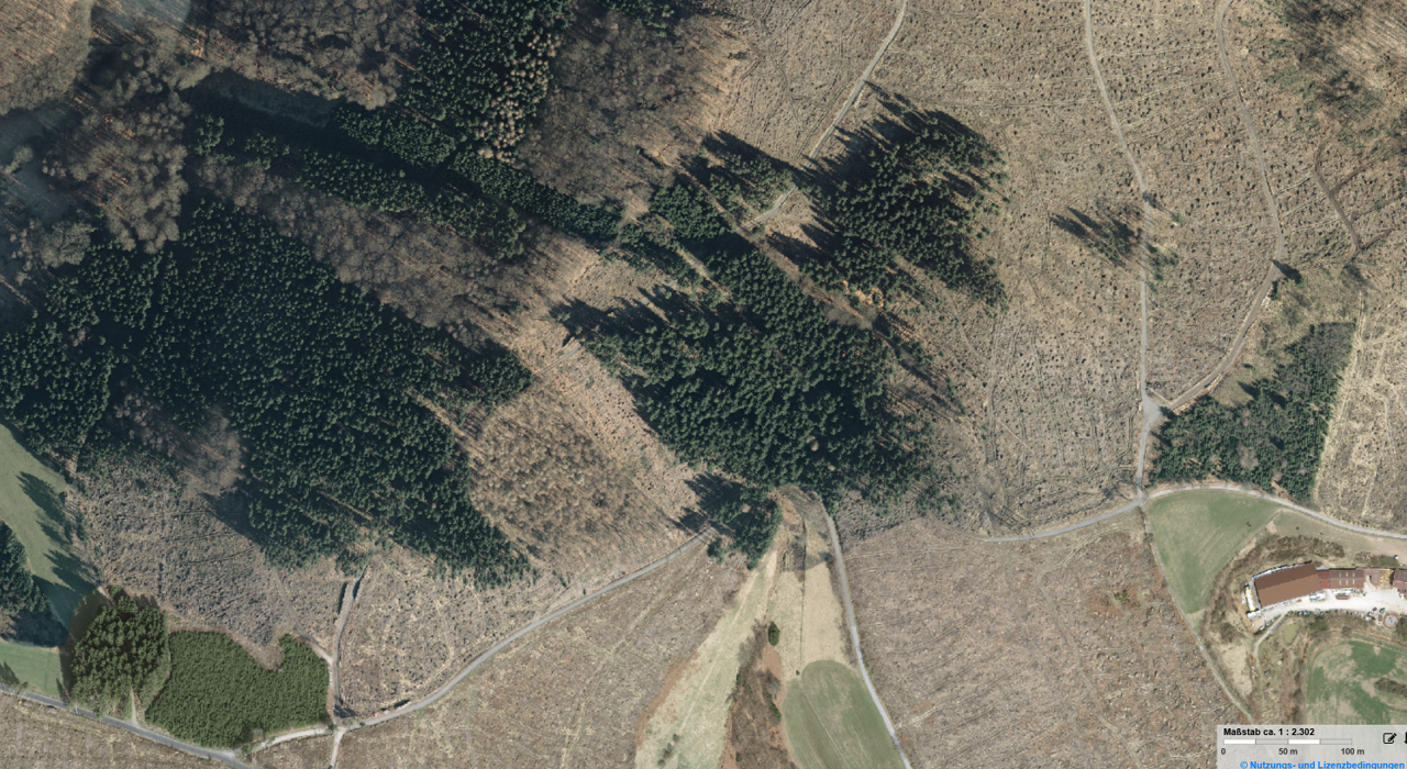 Im Jahr 2021 sind die Fichtenbestände weitgehend der Trockenheit seit 2018 zum Opfer gefallen, die durch günstige Strömungsverhältnise der Vernichtung durch den Orkan Kyrill entgangen waren. Dazu gehört auch ein Bestand im Südwesten des Ausschnitts, der 2007 noch sehr jung und niedrig war.