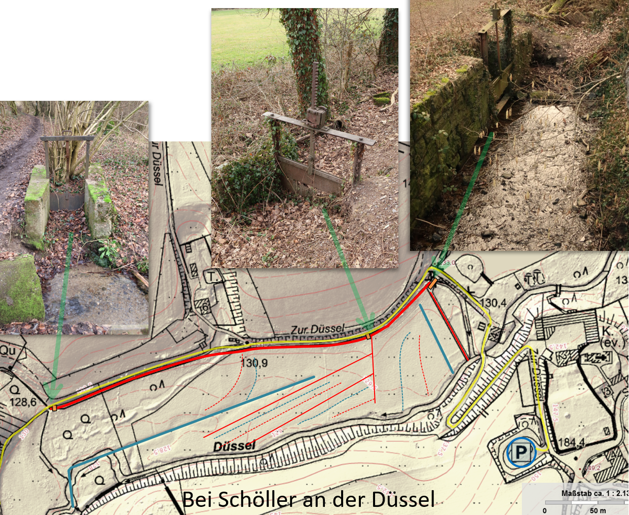 Der Weg vom Parkplatz (gelb) führt an der früheren Mühle (Zur Düssel Nr. 4) vorbei zur ehemaligen Wässerwiese; die Zuleitungsgräben sind rot, die Ableitungsgräben blau eingezeichnet. Drei der insgesamt sieben Stauschleusen sind orange markiert und auf Fotos abgebildet.